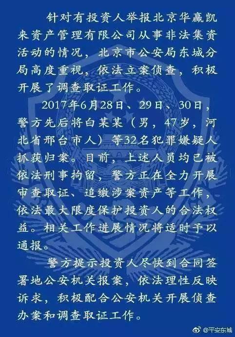 7月2日下午,对于华赢凯来资产管理有限公司涉嫌非法集资,已立案侦查,并先后将公司主要负责人32名犯罪嫌疑人抓获归案,目前已全部刑事拘留。