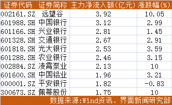 从主力净流入排行榜来看,银行股护盘之功尽显。中国银行(601988.SH)、兴业银行(601166.SH)、交通银行(601328.SH)、光大银行(601818.SH)、农业银行(601288.SH)、平安银行(000001.SZ)纷纷上榜个股净流入前十,其主力净流入分别为3.12亿元、2.18亿元、2.67亿元、2.53亿元、2.46亿元、1.82亿元。此外,无人零售概念股远望谷(002161.SZ)凭借3.92亿元的净流入额成为今日净流入最高的个股,其股价亦实现涨停。