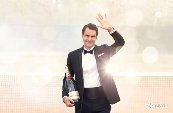 喝车不开酒~可费德勒不仅要代言车,还要代言酒,2012年成为LVMH奢侈品集团旗下、全球销量最大香槟酩悦的代言人。