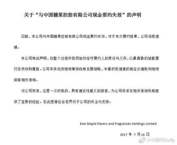 宗馥莉在5月份向中国糖果公司提出现金要约时,每股要约价为0.3565港元,花费金额预计为5.73亿港元。但是随着中国糖果股价的暴涨,截止到7月13日晚间,中国糖果宣布,该公司在要约项下收到涉及4.19亿股股份的有效接纳,仅占中国糖果已发行股本的26.03%,未能达到入股的先决条件,因此收购未能成行。