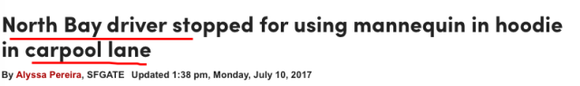 交警走上前去,客座上竟然“坐”着一位戴着墨镜的人体模特,原来司机安排一名“乘客”就是为了名正言顺的蹭到Carpool,交警对此也哭笑不得,最终这名司机还是吃了一张罚单!