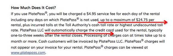一旦选择了PlatePass服务,租车公司将每天收取4.95美金的服务费,包括在未使用PlatePass的用车时间,每月最多收取24.75美元服务费(不包括实际过路过桥费)。 PlatePass将会直接从租车的信用卡扣款,并且收费将不会呈现在租车发票上,他们往往也不会告诉你。