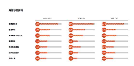 数据显示,东部和南部地区、中西部和北部地区的高净值人群在移民、置业目的地上显现出了较相似的倾向。为了更好地展现地域性差异,本次白皮书将东部和南部地区归类为东南部地区;中西部地区和北部地区归类为西北部地区。结果显示,相对于西北部地区,追求经济投资收益的东南部高净值人群对于科技中心美国西海岸的西雅图(13.1%)、旧金山(10.4%)和经济高度发达的美国东海岸的纽约(9.9%)、波士顿(7.8%)有着相对较强的偏好度。而对于深受环境污染和寒冷干燥气候影响的西北部地区的高净值人群来说,享受良好生活环境的需求使得他们对拥有优质空气质量和自然环境的新西兰(5.4%)和澳大利亚的悉尼(4.3%)也存在相对较高的移民需求。对于高净值人群来说,移民海外在获得了更优越的教育、医疗、环境、资产配置、避税政策、家族资产传承的同时也存在着许多障碍。总体来看,有27% 的高净值人群认为申请等待时间长是海外移民的最主要障碍,其次是语言障碍和不易融入主流社会,占比分别达到17% 和15%。
