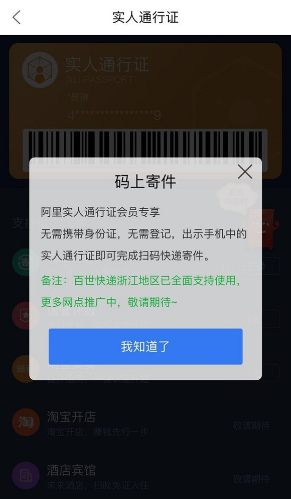 除了快递公司,一些寄件平台包括菜鸟裹裹也开始配合进行实名认证。菜鸟裹裹负责人对界面新闻记者表示,菜鸟裹裹已经上线了实名认证的辅助功能。记者看到,目前菜鸟已经和百世合作,百世浙江地区的快递员可直接通过菜鸟裹裹上的实名信息进行收件。