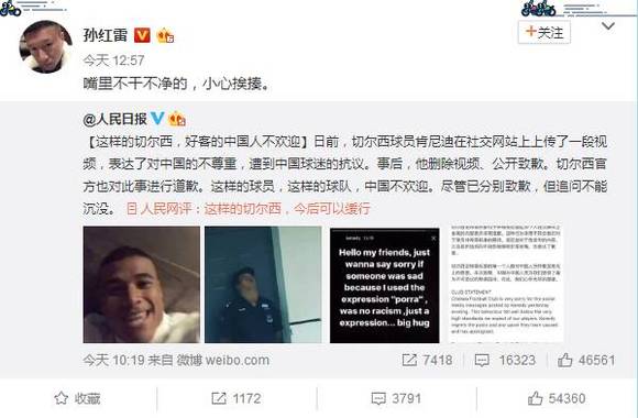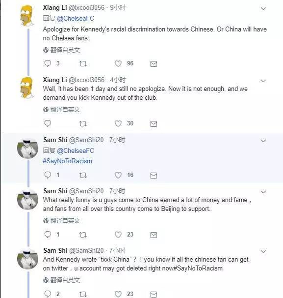 切尔西方面也在第一时间做出了表态,切尔西官方也对此事进行了道歉,切尔西声明写道:“切尔西足球俱乐部对于昨晚肯尼迪在其个人社交媒体上发表的内容表示非常抱歉。这种行为非常不符合我们对于球员非常高标准的期待。肯尼迪对于他发布的内容,以及其所造成的不良影响感到非常后悔,也表达了歉意。切尔西足球俱乐部的每一个人都对中国人民怀着至高无上的敬意。本次旅程,中国与中国人民为我们提供了最为不可思议的热情招待,对此,我们心怀无尽的感激。”