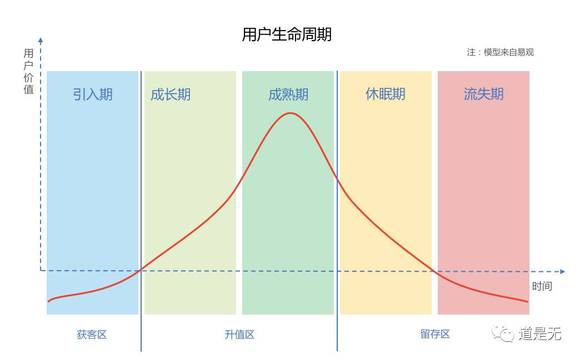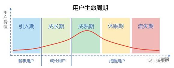 在用户参与度的持续提升、每个节点的持续转化过程中,用户同时完成了在平台内价值的提升和生命周期的一个完整历程(引入期、成长期、成熟期、休眠期、流失期)。