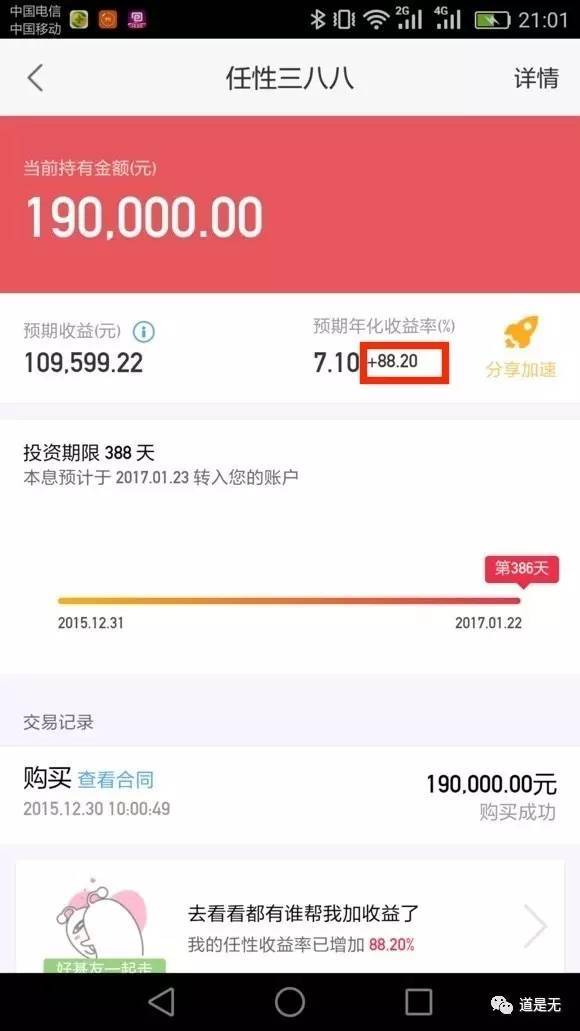 按照这种模式,分享者A可邀请不同的好友参加收益加速,最高可在基础收益率的基础上,将单笔交易产品的收益率提升至100%
