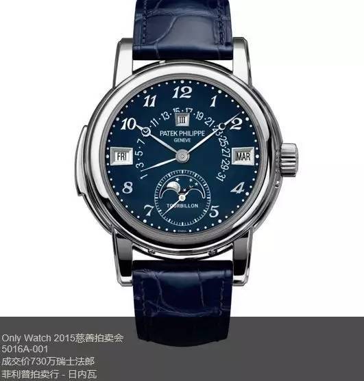 2015年,百达翡丽为第六届Only Watch捐赠的带有三问、万年历、陀飞轮功能的表款ref.5016A,拍出730万瑞士法郎,创出现代表款最高价格。