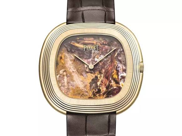 伯爵响应主题色的办法很特别,除了采用黄金表壳,还使用坚硬的黄棕色石头制作盘面。
