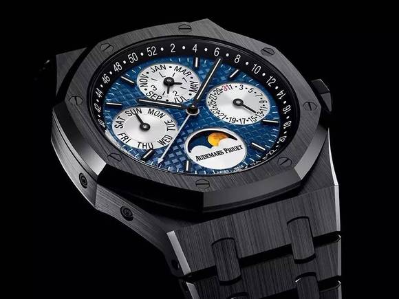 最后一只,看一下爱彼捐赠的万年历,2017年SIHH发布的全新腕表,为了响应慈善拍卖的主题色彩,爱彼为这只黑色陶瓷腕表配备了黄色月相。
