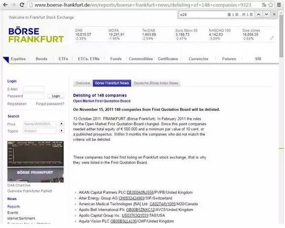 加拿大乐活网lahoo.ca获悉,“O24”公司于2008年由Mobile Assets PLC公司改名得来,后被强制解体又从法兰克福证交所摘牌。2015年12月5日,龚晓华在英国重新注册组建“O24”公司,但没有在加拿大合法登记证券交易业务,“O24”股票、CNTV股权也没有依法登记,资料显示,O24的股票代码为ISIN GB00B293GY99,在德国法兰克福交易所挂牌上市。在法兰克福交易所上可以查到O24的信息,但是该公司已经被归属于退市行列。通过查询O24的股票交易记录,O24股票交易开始于2008年2月8日,结束于2011年11月15日,历时3年半多,一共开盘交易了82天。开始交易时标价1欧元,退市的时候是标价5分。从始至终没有成交量,换句话说,从开始上市,到最后退市,没人买过这只股票。