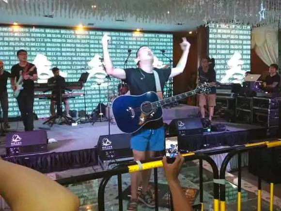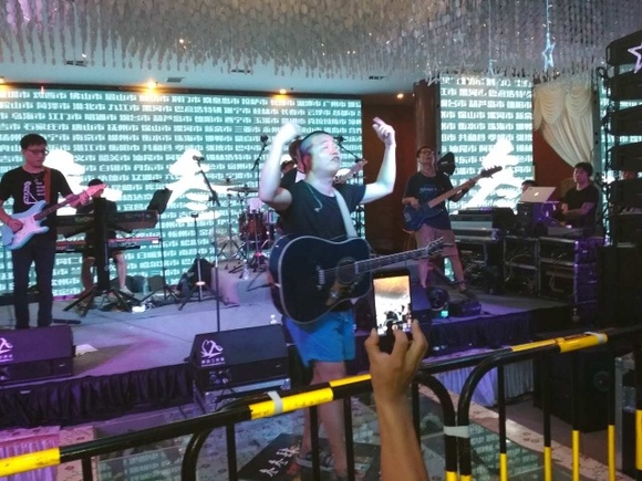 穿着蓝色短裤、球鞋、黑T恤,没有偶像包袱的偶像歌手,在台上带着全场嗨了起来。(也有人说,逼哥可能急急忙忙换场地,裤子忘了换了,蓝色小短裤造型抢镜成功。)