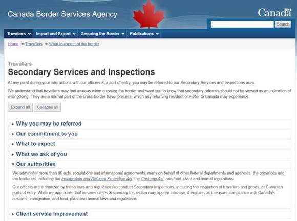 此外,加拿大边境服务署有权搜查你的行李、皮夹、电子产品(包括手提电脑和手机)、车辆及其他物品,这是加拿大海关法授予的权限,且无需持特许令。