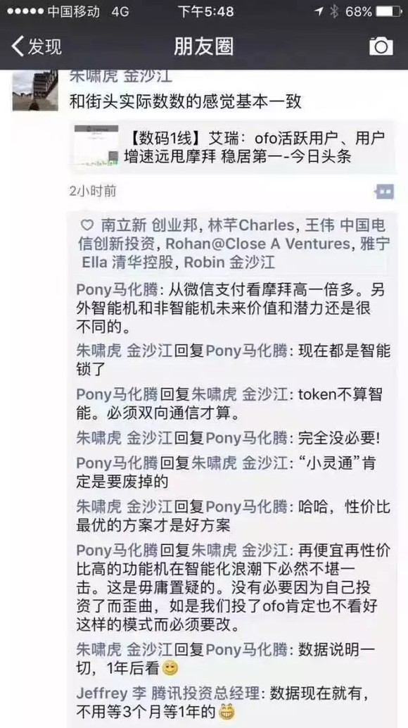 一向“人狠话不多”的马化腾表示出不满,在这条朋友圈回复称:微信支付数据里,摩拜高出一倍多。智能机和非智能机的未来价值和潜力完全不同。还表示,ofo的token不算是智能锁,“小灵通”肯定是要废掉的。