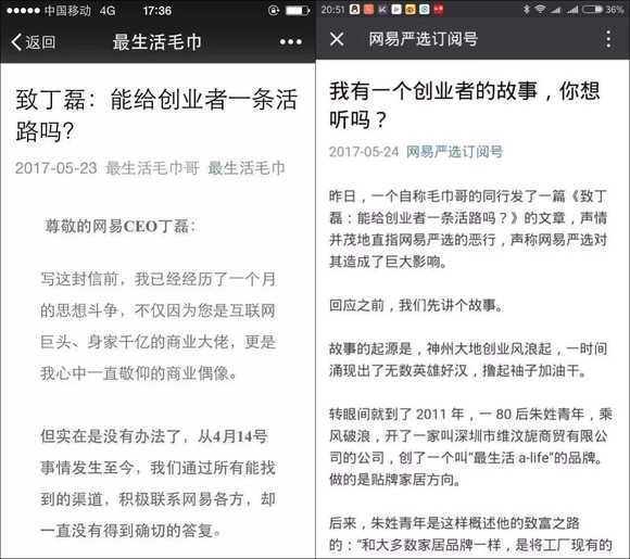 5月23日,最生活毛巾创始人朱志军发表《致丁磊:能给创业者一条活路吗?》一文,指出其生产的“阿瓦提长绒棉毛巾”是G20唯一指定毛巾品牌,而网易严选在其不知情的情况下打出“G20专供同款”的行为构成了侵权。