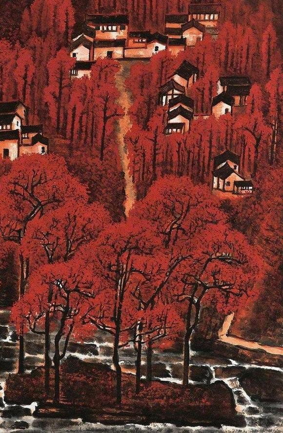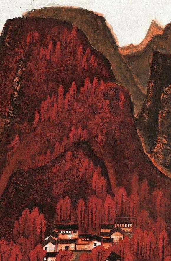 “看万山红遍、层林尽染”是毛泽东词作《沁园春·长沙》中的名句,描述了深秋时分,湘江之滨的岳麓山漫山古树皆红的壮丽奇景。五十年代开始,尽管中国画坛掀起了描绘毛泽东词意的热潮,但极少有画家敢于尝试“万山红遍”这一题材。一方面,“万山”之意境颇为辽阔深远,极大地考验着画家的空间驾驭能力,若非胸有千山万壑,则根本无法表现“万山”;另一方面,“红遍”给中国传统山水画出了个大难题:历来山水多以水墨描绘,仅作为点缀的红色在使用上可谓慎之又慎,更莫提“红遍”了。这两大创作难点,令当时的画家普遍将其视为畏途,无从落笔。