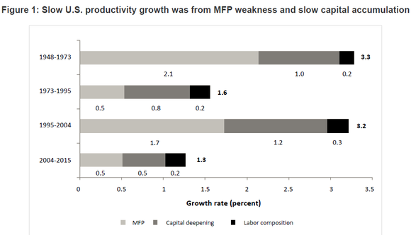 二战后,美国劳动生产率的增长经历了几个起伏波动的阶段。1948-1973年间,美国劳动生产率增长强劲,增速达到3.3%,MFP贡献了2.1个百分点。此后,1973-1995年间,劳动生产率增速降到了1.6%,MFP仅贡献了0.5个百分点。随后,1995-2004年间,劳动生产率增速回升到3.2%,MFP贡献了1.7个百分点。劳动生产率增长第二次放缓始于2004年左右。2004-2015年间,美国劳动生产率增速下降到1.3%,MFP贡献了0.5个百分点。