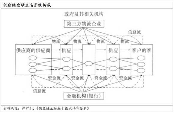 ● 从银行角度来看,供应链金融作为融资的新渠道,不仅有助于弥补被银行压缩的传统流动资金贷款额度,而且通过上下游企业引入融资便利,自己的流动资金需求水平持续下降。另一方面,供应链金融为银行提供了一个获取稳定高端客户的渠道,通过面向供应链系统成员的一揽子解决方案,核心企业被“绑定”在提供服务的银行;