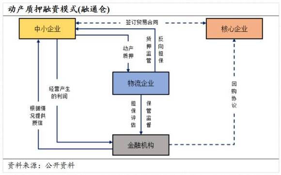 ● 动产质押融资模式:中小企业利用手头上的货物抵押申请贷款,货物存放在第三方监管公司,由第三方监管公司负责货物的监管、货价的评估以及货物的发放等,金融机构在一定程度上借鉴监管公司给出的评估结果发放贷款,中小企业用运营所得还贷。