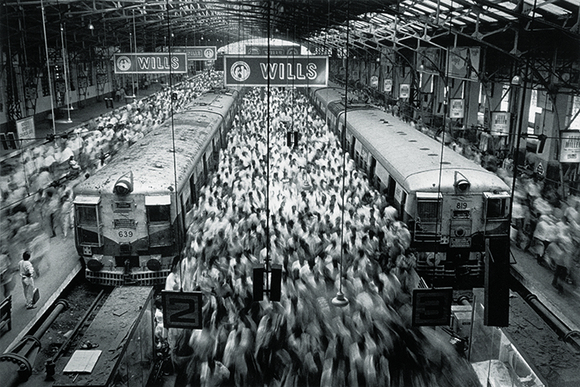 教堂门站是孟买郊区铁路西线的终点站,每天大约有两百七十万人搭乘火车去城里工作。印度,1995年