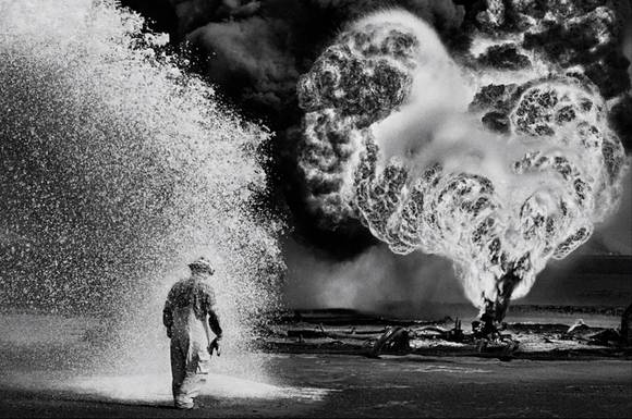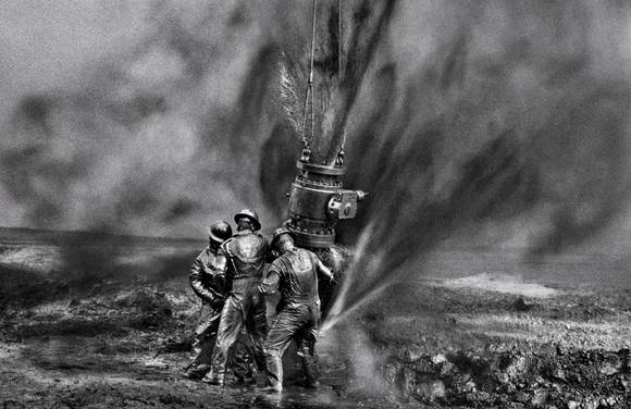 照片里这些满身石油的人,是来自加拿大卡尔加里的消防员。他们有一辆漂亮的红色消防车,每天晚上回到驻地,他们都会把车刷洗得干干净净,但第二天一大早,他们又开着漂亮的消防车重返油田…