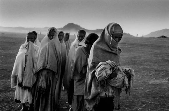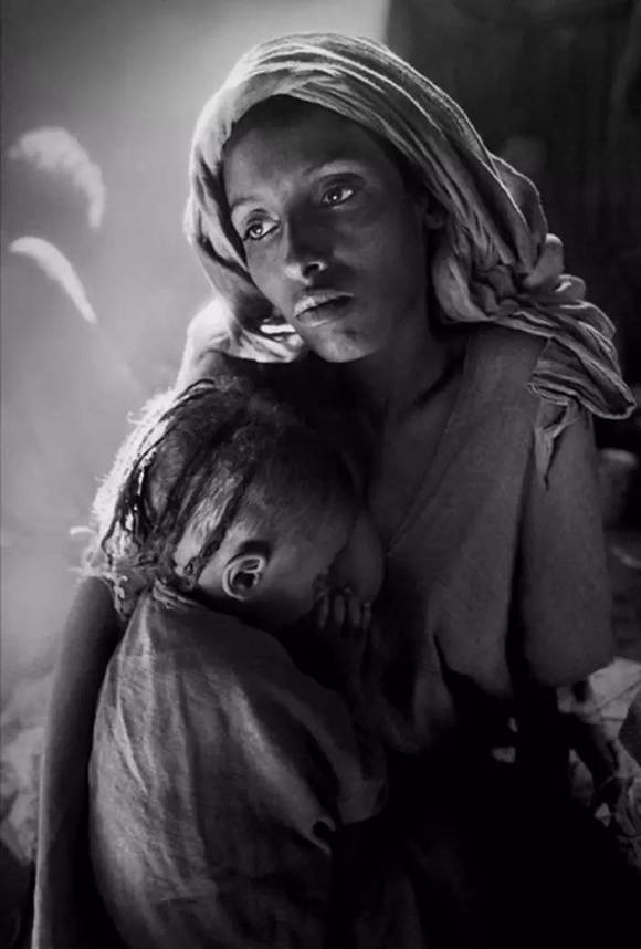 这张照片里的是科普特人,他们来自埃塞俄比亚的北部地区。他们信奉科普特教,一年中必须禁食200多天,即使孩子快饿死了,也绝不违反教规,他们只等待死亡的降临。在这里,死亡是日常生活的一部分。由于见过太多的死亡,他们的心理有很强的免疫能力,已经能随时接受亲友的离去。他们年轻的脸庞上,有一双行将就木的眼睛,空洞而无神。