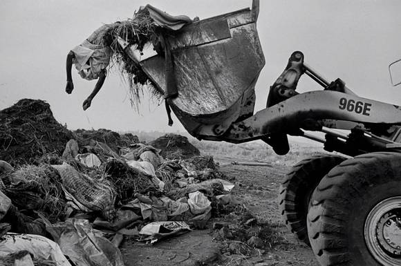 每天至少有12000-15000人死亡。人们无法安葬所有的死者,他们用一辆法国军方的铲车,把尸体铲到一起,十来个人一堆,再挖土掩埋。