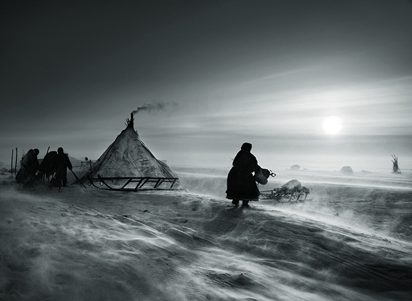 当气候急剧恶化,涅涅茨人和他们的驯鹿便会在一个安全地段停留数日。摄于俄罗斯西伯利亚的亚马尔半岛, 鄂毕河以北的北极圈。