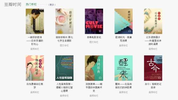 2017年3月7日,豆瓣时间首期节目《醒来——北岛和朋友们的诗歌课》正式上线,据悉这期课程的销售数量已上万。截止目前为止,豆瓣时间一共推出十个专栏,发布者不乏北岛、杨照、白先勇、叶嘉莹等大家;内容涵盖了文学、音乐、茶艺、电影、历史等方面;价格从68元到128元不等。