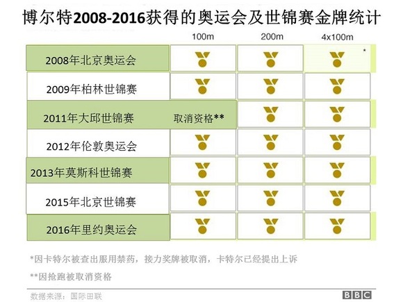 而在世锦赛生涯中,博尔特的缺憾仅仅是今年伦敦的铜牌及2011年在韩国大邱的抢跑,那次抢跑在当时就意味着自动取消比赛资格。
