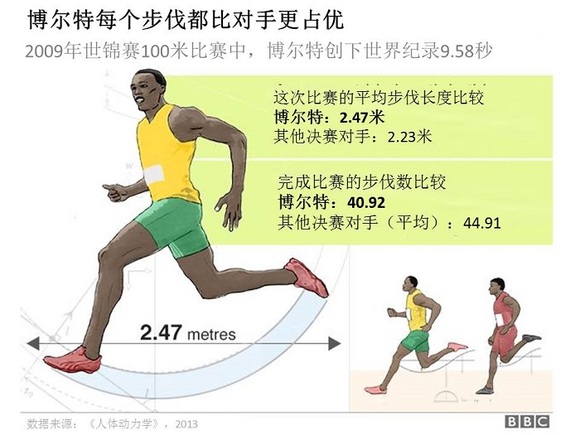 在博尔特破100米世界纪录的那次比赛中,他的步伐少于41次,而其他决赛对手平均次数几乎达到了45次。