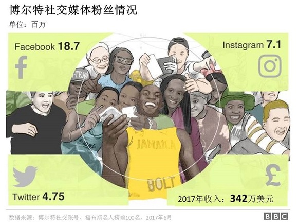 在他退役之际,他已成为了社交媒体中最受欢迎的田径运动员之一,他的Facebook、Ins及Twiter粉丝数量分别将近1900万、710万、475万。