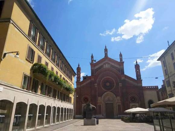 隔壁古朴的意大利传统红砖建筑卡尔米纳圣母教堂(Chiesa Santa Maria del Carmine)和现代气息浓郁的店铺冲撞出鲜明的对比。
