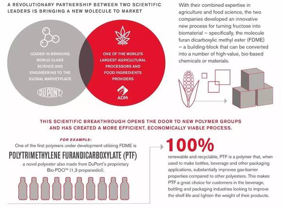 与ADM公司合作,杜邦推出了一种新型的生物基材料,它衍生自美国能源部根据原材料对制造业的重要性而鉴定的12种化学结构单元之一,可以转化为多种高附加值的、生物基的化学材料,或是在许多应用中提供高性能的材料。