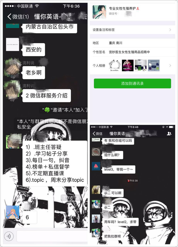 除了负责群里的事务,她还要时不时私聊学员,询问学习状态,耐心的解答学员的问题。通过我和班主任的聊天,得知她负责着8个这样的百人群,都是99/月课程的学员。想想她每天要和至少800人聊微信,真的感觉很心疼,想给她的午饭加个鸡腿。