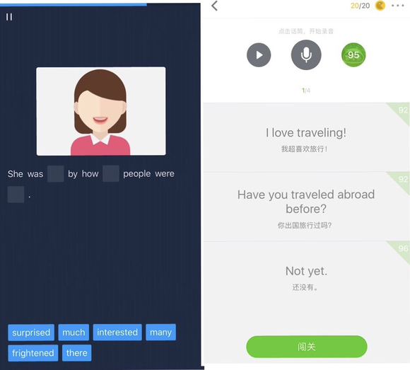 图文并茂的全英文教学是其最大特点,沉浸式的教学模式有利于培养语感,较多的口语训练和评分一定程度上弥补了中国哑巴英语的教育缺憾。