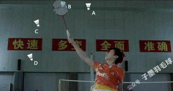 四个击球点,在A的时候,属于头顶球,最好采用正手高远球的处理方法;在C的时候多半是回平高球,要想打出高远球就比较难;在D的时候属于被动抽球,此时很容易挂网,质量度大大降低。