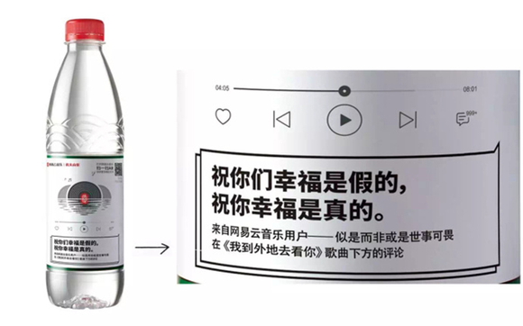 再看本次网易云音乐联合农夫山泉打造的“乐瓶”,瓶身点缀了黑胶唱片图案、进度条等音乐元素,加上“999+”的评论元素,乐感十足。而那30条精选乐评,则是根据“文字简练便于印刷、故事年轻有趣、脱离歌曲本身仍可被理解”这三个标准,从后台数据中筛选而来。30条乐评就是30条走心的文案,背后那30个平凡而独特、饱含着回忆与情绪的故事,让每一个人都能找到自己的“知音”。