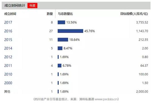 根据清科私募通数据显示,截至8月,四川省2017年已成立8支政府引导基金,目标规模为3755.52亿人民币。从募资规模来看,四川省产业引导基金呈逐年上升趋势。