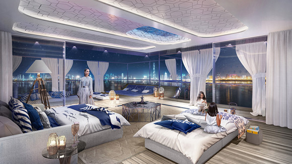 水上第一层是一个开放式起居室、餐厅和厨房。开放式起居室像多功能会客厅,坐在沙发床上就可以享受日光浴。室外有一个类似于蹦床的方形镂空网,可以在上面嬉戏玩耍。甲板活动区配有迷你酒吧、餐厅及按摩浴缸,在享受海风的同时,品尝着美味与美酒,岂不乐哉。当然,如果你想一展自己的泳姿,还可以从甲板上纵身一跃,寻求刺激的跳进水中,也可以走提供的安全梯到达水中。