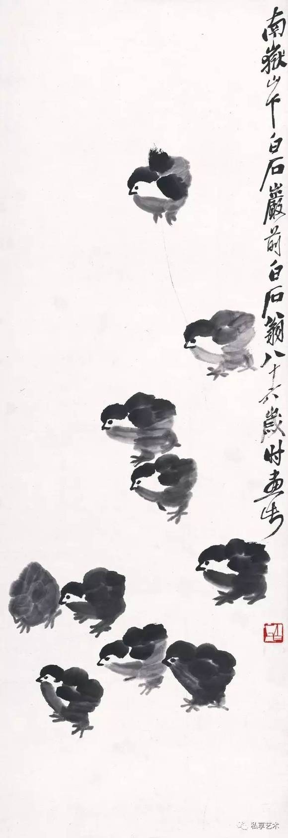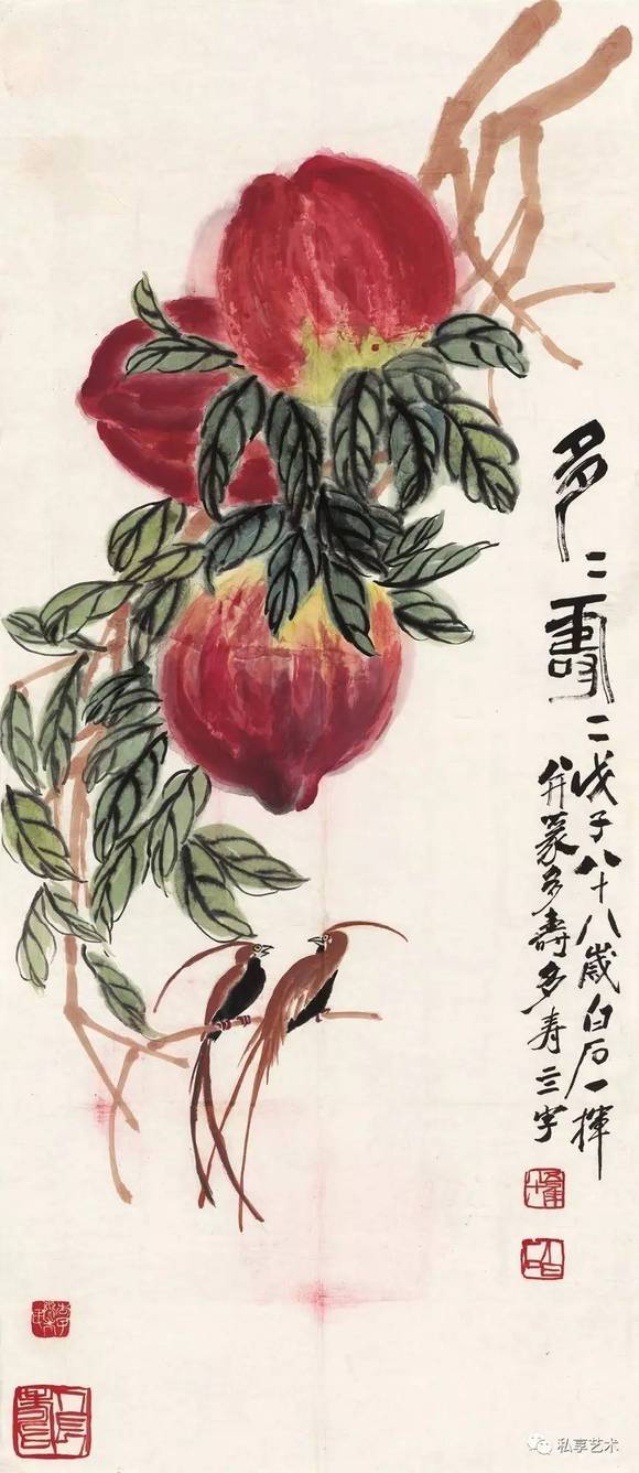 予少贫,为牧童及木工。一饱无时而酷好文艺。为之八十余年,今将百岁矣。作画凡数千幅,诗数千首,治印亦千余。国内外竞言齐白石画。予不知其究何所取也。印与诗则知之者稍稀。予不知知之者之为真知否?不知者之有可知者否?将以问天下后世。