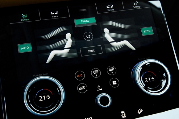 除了两块触摸屏,该车还配备了两个手感极好的控制旋钮。经过设置,用户可通过这些旋钮实现诸多功能,包括调整车内温度、设置座椅按摩功能、以及选择全地形反馈适应系统的模式。两块屏幕之间还设有音响系统的控制旋钮。
