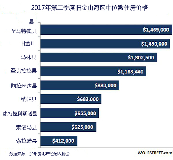 从图表可以看出,旧金山的家庭住房价格位列第二名,仅次于圣马特奥县,该县包括了硅谷的北部地区。圣克拉拉县位列第四名,该县包括了硅谷的南部地区。