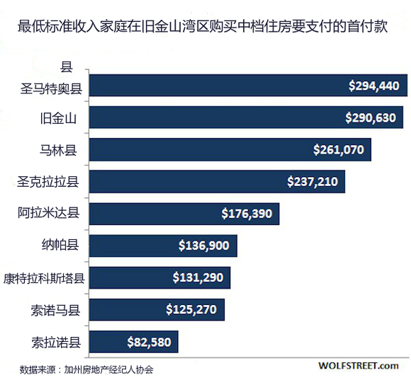剩余的20%则是难以估算的首付款。而在旧金山和圣马特奥县,一套中档住房的首付款就高达30万美元。另外,除了要交高昂的首付款,买家每月还需要支付抵押贷款、财产税和保险费。参考历史最低的抵押贷款利率(固定利率低于4%),一个最低标准收入的家庭要在旧金山和圣马特奥县买一套中档住房每年需要支付约30万美元。由此可以看出,当你购买价格越高的住房,你的负担能力就越低。