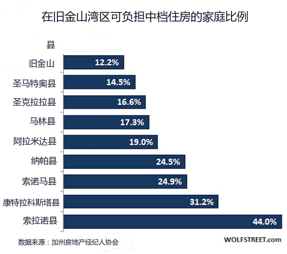 不过,现在旧金山湾区正面临一个非常尴尬的局面。以旧金山为例,从图表可以看出只有12%的家庭可以购买一套中档住宅。而在一个稳定的房地产市场中,该比例能够达到50%。现在的问题是,如果只有12%的家庭具有购买力,那剩下的住房要卖给谁?