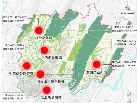 2016年,两江新区再次优化功能布局,明确将充分利用两江新区整合机遇,优化“一心四带”发展布局,在更大范围内优化配置资源要素,重点建设“六城八园”,促进人口、产业集聚。根据规划,龙盛产业新城建成区面积为178平方公里,常住人口规模将达到80万人。重点打造国内重要的汽车生产基地、综合物流基地、都市文化旅游目的地和滨江宜居新城。