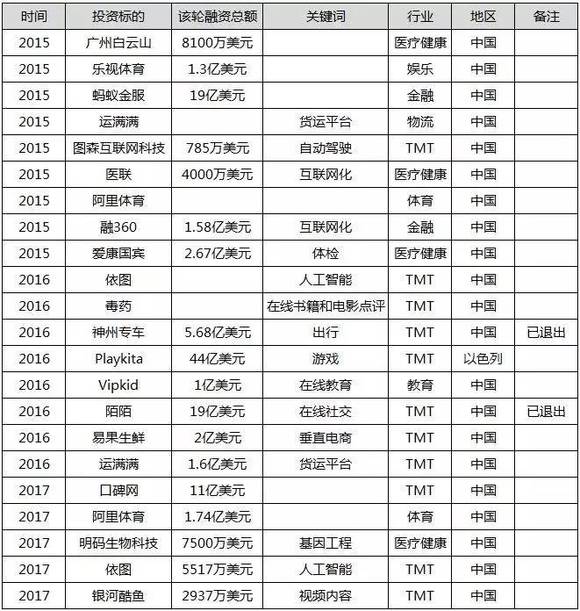 云锋基金的投资同样绕不开互联网,2015年以来总计在TMT领域投资10笔,合计投资金额83亿美元。垂直电商领域,与阿里资本、中银国际、KKR、瑞士信贷、苏宁、高盛等出资2亿美元投资易果生鲜;阿里版图下,与鼎晖投资、淡马锡、Silver Lake Management、春华资本等6家机构11亿美元投资口碑网;出行服务方面,与阿里巴巴集团、申万宏源、中金公司等共计6家机构共同出资5.68亿美元投资神州专车(后退出);知识内容方面,先是在2016年投资在线书籍和电影点评网站“毒药”,与优酷土豆、洪泰基金等4家机构以2937万美元投资视频内容生产商银河酷鱼;社交软网方面,与阿里巴巴集团、华泰瑞联基金、经纬中国共同出资19亿美元投资陌陌(后退出);云锋基金与马云个人还与鼎晖投资、泛海控股、弘毅投资、中国民生信托史玉柱旗下的巨人网络集团、韩国游戏上市公司Netmarble Games(KRX:251270)等8家共计投资机构(者)44亿美元收购以色列游戏企业Playtika。