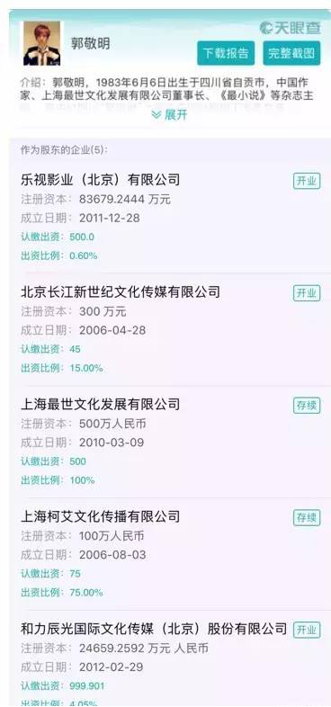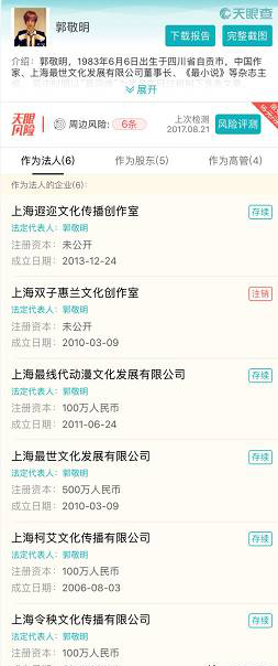 与此同时,郭敬明还是6家公司的法人代表,包括上海遐迩文化传播创作室、上海双子惠兰文化创作室、上海最线代动漫文化发展有限公司、上海最世文化发展有限公司、上海柯艾文化传播有限公司以及上海令秧文化传播有限公司。