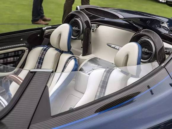 新车内饰采用了蓝白相间的配色,同时还移植了Huayra的座椅,方向盘由蓝色皮质材料和木质材料组合而成。