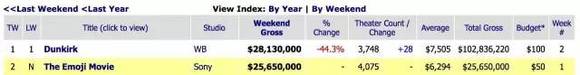 然而,就在海内外市场都做好了这部影片扑街的准备时,这部电影的票房成绩却让所有人都吃了一惊。在电影上映三天后,表情包大电影的票房成绩仅次于《敦刻尔克》排名第二,而后者的烂番茄新鲜度是92%。即便在如今上映后的第27天,《表情奇妙冒险》也靠着7366.78万美元的成绩牢牢把住了第6名的位置。